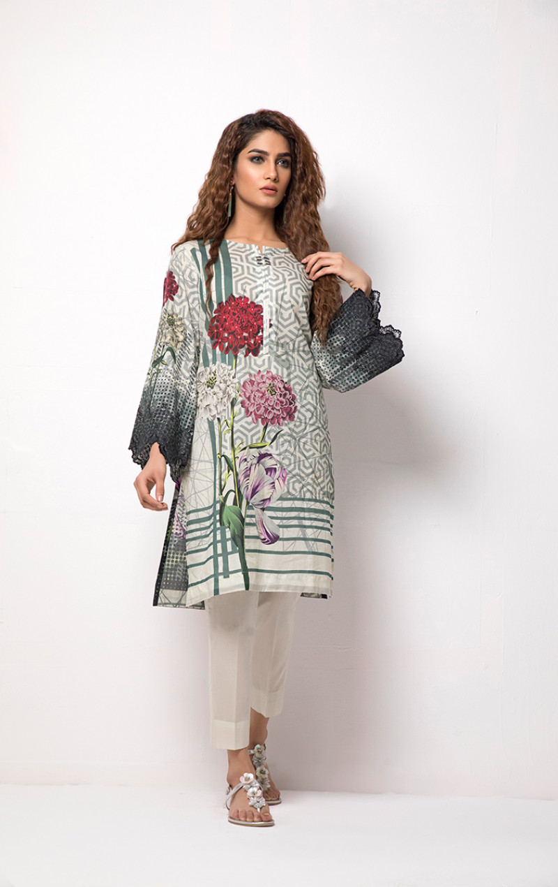 Stitched kurti with embroidered sleeves and metallic accessories on neckline.